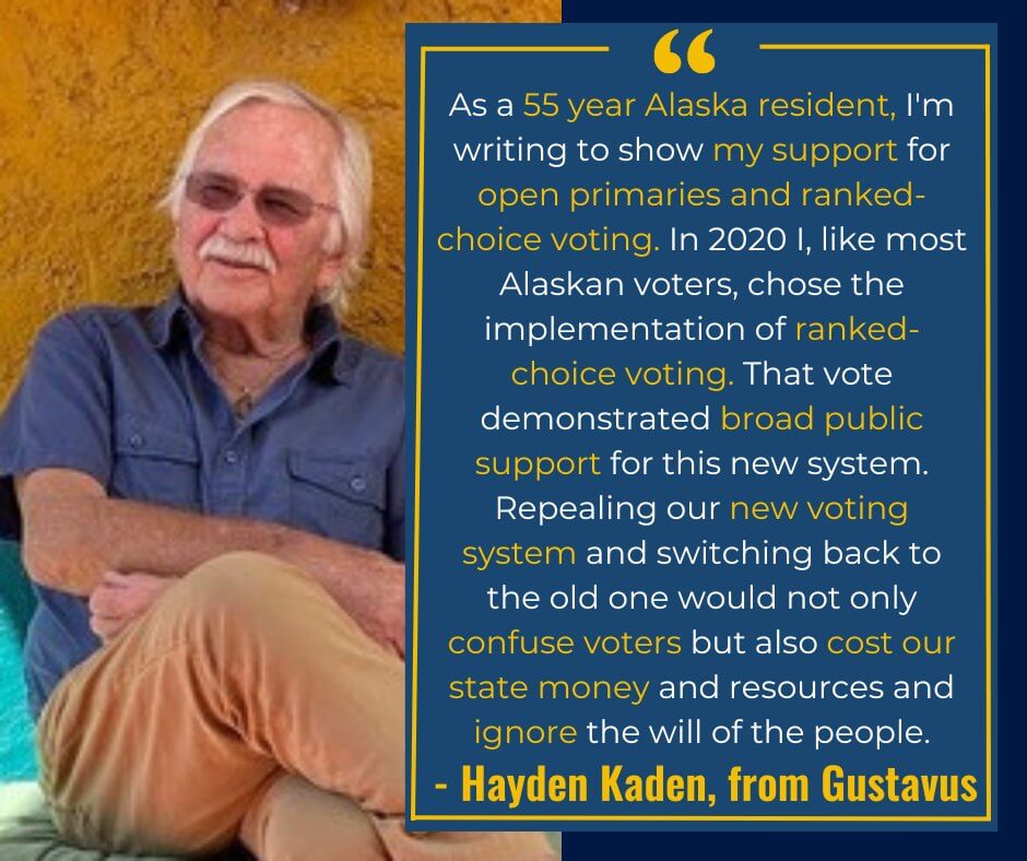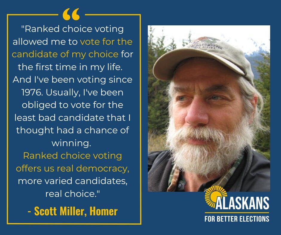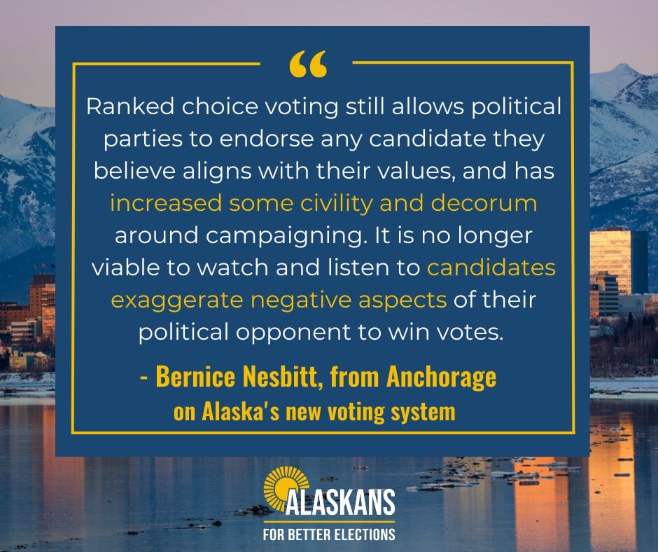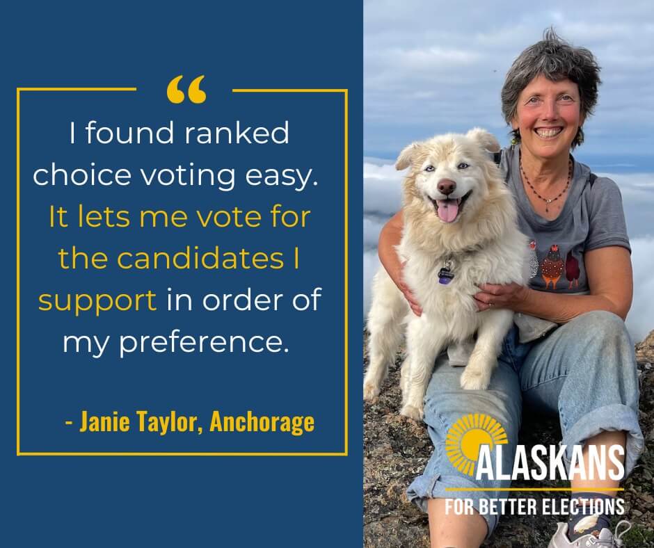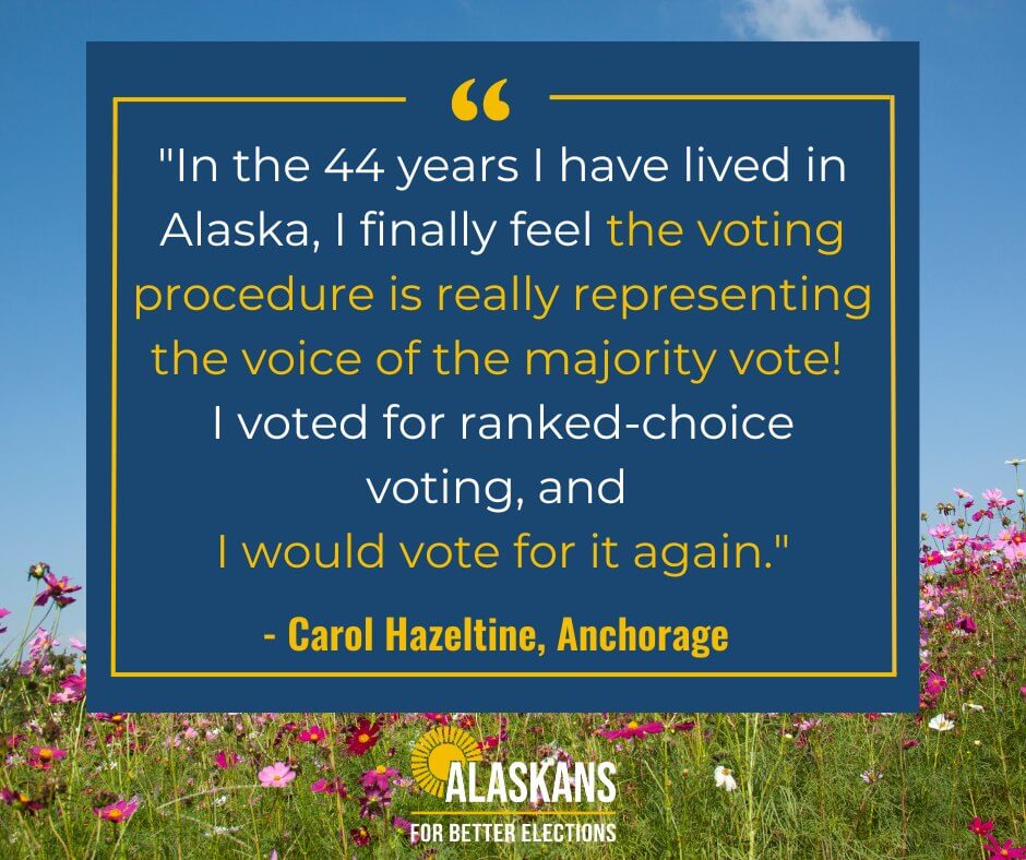 "In the 44 years I have lived in Alaska, I finally feel the voting procedure is really representing the voice of the majority vote! I voted for ranked-choice voting, and I would vote for it again."