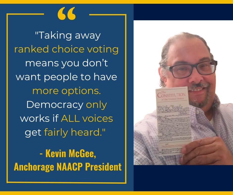 "We support ranked choice voting because it gives everybody options... The candidate should be able to get the message out, and then let the people decide who they want to vote on. Taking away ranked choice voting means you don’t want people to have more options."Kevin McGee NAACP Anchorage President