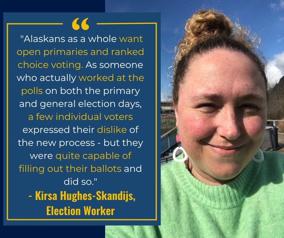 "I appreciate the option to rank or not rank certain candidates. I was able to control the process; no one else was selecting a candidate in a closed primary process that I wasn’t part of, then leaving me with the options they chose. I was able to cast my vote how I wanted."La quen náay Liz Medicine CrowFirst Alaskans President and CEO