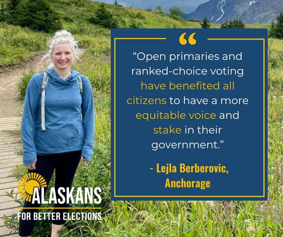 "The open primary and ranked choice voting system gets us back to basics. Candidates have to earn each vote, one vote at a time. The current election system is a big, dynamic positive change of being able to vote for candidates."Jennifer Johnston Former Alaska State Representative
